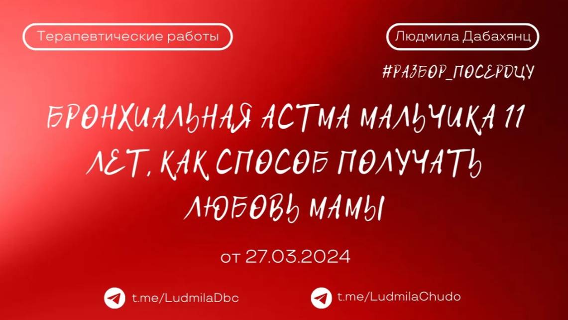 Терапевтическая работа #разбор_поСердцу Бронхиальная астма мальчика 11 лет, как способ получать любовь мамы. Полное видео: https://rutube.ru/video/035569b2af8394ce1a78f0d24229888c/ ‼️ до встречи на следующей неделе, успевайте отправить заявку на участие в разборе, заявки на разбор принимаются лс - https://t.me/ludmiladbc Провела беседу: #просто_волшебница психотерапевт, целитель ЛЮДМИЛА ДАБАХЯНЦ Канал https://t.me/LudmilaChudo ‼️ канал #ТВОРЕЦ_СВОЕЙ_РЕАЛЬНОСТИ Подробнее: https://rutube.ru/plst/366415 2024 руб/месяц Заходите в бот - https://t.me/ludmiladbc_bot , если хотите участвовать ✓ Обязательно поставь 💗 ✓ Подпишись на канал ✓ И поделись с близкими Это будет вашим балансом за движение и получение энергии. Если есть желание создать баланс брать-давать... приму от всего сердца с благословением (донейшн) С Огромной Любовью, Дабахянц Людмила 💓 ✨ Telegram: https://t.me/ludmiladbc ✨ Канал в telegram “Я ЕСТЬ ТО, ЧТО Я ЕСТЬ”: https://t.me/LudmilaChudo ✨Онлайн-школа: https://ludmilachudo.skillspace.ru/school