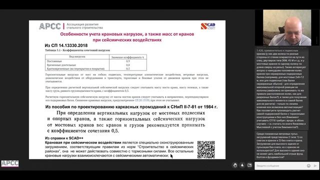 Докладчик: Андрей Теплых Зам. генерального директора по маркетингу ООО НПФ "СКАД СОФТ". Программа: - компоновка поперечника промышленного здания и расчетной модели плоской рамы вокруг крана; - расчет крановых нагрузок по параметрам кранов из ГОСТ или паспортных данных производителей; - требования СП 20.13330.2016 к нагрузкам от мостовых или подвесных кранов; - моделирование крановых нагрузок в плоских и пространственных моделях; - моделирование логических связей между загружениями в SCAD++ для выбора РСУ; - расчет прогибов при действии крановых нагрузок; - особенности учета пульсационной составляющей ветровой нагрузки при наличии крановых нагрузок в плоских и пространственных моделях; - особенности учета крановых нагрузок при сейсмических воздействиях в плоских и пространственных моделях. Материалы подготовлены с применением программы SCAD++.