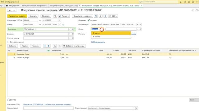 1С ФРЕШ Бухгалтерия Поступление на несколько складов. Оформление Приходного ордера М4