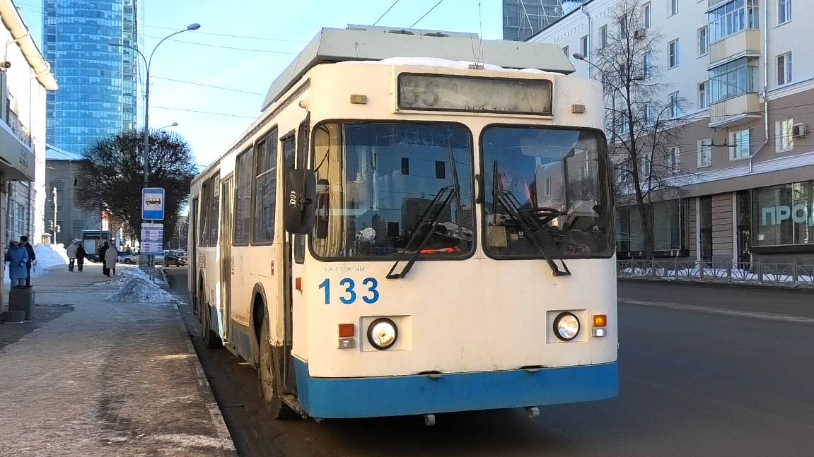 Троллейбус ЗиУ-682 КР Иваново борт. №133 маршрут №35 "Ботаническая - Крауля" следует через остановку "улица Горького". Город Екатеринбург, Россия. Приписка: Октябрьское троллейбусное депо. 24.01.2024