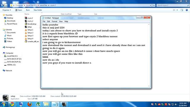 the download link for crysis 2 http://kat.ph/crysis-2-2011-repack-black-box-4-5-gb-t5904819.html or if the link is dead go to the official site of blackbox you just have to google it if you do not get it from there just follow the steps show in the vid i know gyes it is a boring video with no sound i realised this when i was uploading it has no song srry....but the mostwanted 2012 will have one i promise srrry