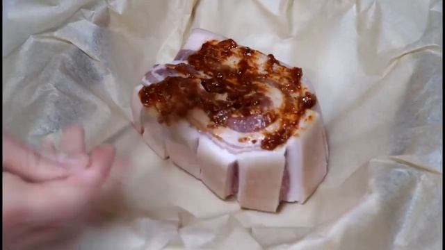 Рецепт: Свиная грудинка - 800 г чеснок - 1/2 головки соль - 1 ч.л. черный перец - 1 ч.л. паприка - 1 ч.л. горчица - 1 ч.л. растительное масло - 2 ст.л. запекать 1 час при 200С, а затем охладить.