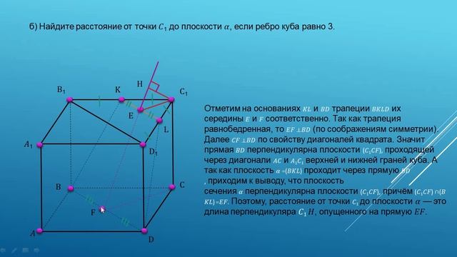 ДОСРОЧНЫЙ ВАРИАНТ ЕГЭ ПО МАТЕМАТИКЕ 2026 27.03.2026 профильный уровень В кубе 𝐴𝐵𝐶𝐷𝐴1𝐵1𝐶1𝐷1 точка 𝐾 — середина ребра 𝐵1𝐶1. Плоскость 𝛼 проходит через точки 𝐵, 𝐾 и 𝐷. а) Докажите, что сечение куба плоскостью 𝛼 является равнобедренной трапецией. б) Найдите расстояние от точки 𝐶1 до плоскости 𝛼, если ребро куба равно 3.