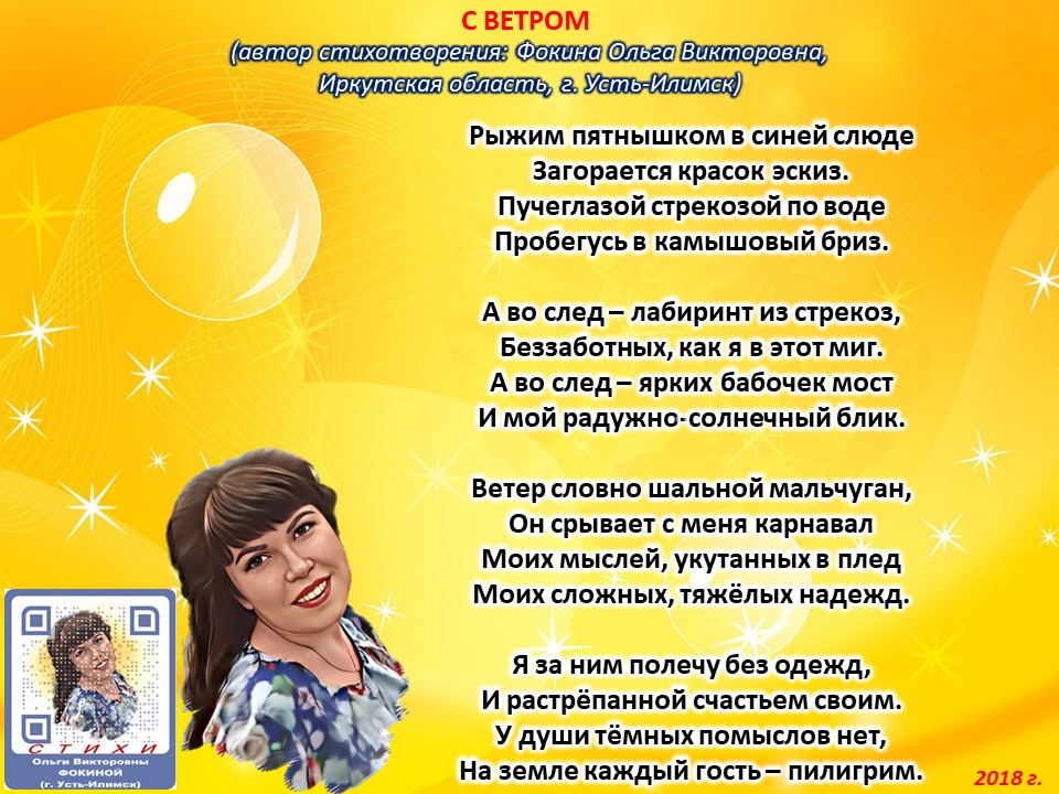 Читает автор стихотворения: ФОКИНА ОЛЬГА ВИКТОРОВНА (Иркутская область, город Усть-Илимск) СТИХИ: https://stihi.ru/2018/07/08/3790 БИОГРАФИЯ: http://www.proza.ru/2019/10/08/1473 ВЫИГРЫВАЙТЕ КНИГИ БЕСПЛАТНО: https://proza.ru/2017/09/17/447 ОТЗЫВЫ ЧИТАТЕЛЕЙ: http://www.proza.ru/2019/11/29/611 Из книги Фокиной Ольги Викторовны (Усть-Илимск) «Несу добро в ладошках!»: [все стихотворения с 2005 по октябрь 2020 гг., проза, авторские песни, интервью]. – Москва: МГО Союза писателей России, 2020 г. – 886 стр., ил. ISBN 978-5-7949-0826-8 С ВЕТРОМ (автор стихотворения: Фокина Ольга Викторовна, Иркутская область, г. Усть-Илимск) Рыжим пятнышком в синей слюде Загорается красок эскиз. Пучеглазой стрекозой по воде Пробегусь в камышовый бриз. А во след – лабиринт из стрекоз, Беззаботных, как я в этот миг. А во след – ярких бабочек мост И мой радужно-солнечный блик. Ветер словно шальной мальчуган, Он срывает с меня карнавал Моих мыслей, укутанных в плед Моих сложных, тяжёлых надежд. Я за ним полечу без одежд, И растрёпанной счастьем своим. У души тёмных помыслов нет, На земле каждый гость – пилигрим. 22 марта 2018 г.