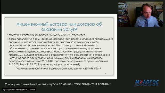 Авторская видеолекция Виталия Калятина «Место и значение лицензионного договора в системе способов распоряжения правом на программное обеспечение» В рамках данной лекции рассмотрены вопросы определения лицензионного договора, установления случаев когда лицензионный договор является правильным выбором, а когда от него лучше воздержаться, ключевые отличия лицензионного договора от других способов распоряжения правом на программное обеспечение. Программа: 1. Понятие лицензионного договора. 2. Разграничение лицензионного договора с другими способами распоряжения правом. 3. Лицензионный договор при совместном правообладании. Лектор: Виталий Калятин — к.ю.н., профессор Исследовательского центра частного права им. С.С. Алексеева при Президенте РФ, доцент департамента права цифровых технологи и биоправа НИУ ВШЭ (https://m-logos.ru/lecturers/kalyatin-vitalij-olegovich/) *** Эту лекцию можно посмотреть на сайте Института: https://m-logos.ru/product/m-lawbooksavtorskaya-videolekcziya-vitaliya-kalyatina-mesto-i-znachenie-liczenzionnogo-dogovora-v-sisteme-sposobov-rasporyazheniya-pravom-na-programmnoe-obespechenie-2/ *** Более подробно данные вопросы рассматриваются в рамках онлайн-курса повышения квалификации Юридического института «М-Логос»: ✅ Сделки в отношении прав на программы для ЭВМ и защита прав на такие программы: актуальные правовые и практические вопросы 24.11.25 - 19.12.25 (36 ак.ч.) https://m-logos.ru/onlain_seminars/sdelki-v-otnoshenii-prav-na-programmy-dlya-evm-i-zashhita-prav-na-takie-programmy-aktualnye-pravovye-i-prakticheskie-voprosy/152800_24112025_19122025/ ✅ Авторский курс А.И. Савельева «Правовые аспекты разработки программного обеспечения» 28.01.26 - 20.02.26 (30 ак.ч.) https://m-logos.ru/onlain_seminars/avtorskij-kurs-a-i-saveleva-pravovye-aspekty-razrabotki-programmnogo-obespecheniya/164897_28012026_20022026/ ✅ Сделки в отношении прав на программы для ЭВМ и защита прав на такие программы: актуальные правовые и практические вопросы 17.02.26 - 20.03.26 (36 ак.ч.) https://m-logos.ru/onlain_seminars/sdelki-v-otnoshenii-prav-na-programmy-dlya-evm-i-zashhita-prav-na-takie-programmy-aktualnye-pravovye-i-prakticheskie-voprosy/164312_17022026_20032026/ *** Все мероприятия Института по данному направлению смотрите здесь https://m-logos.ru/direction/internet-pravo-i-razrabotka-po/ 📚 Расписание всех курсов повышения квалификации юристов смотрите на сайте https://m-logos.ru/onlain_seminars/ 🎬 Рекомендуем другие бесплатные лекции (раздел регулярно обновляется) https://m-logos.ru/online_lectures *** Анонсы предстоящих бесплатных лекций публикуются в социальных сетях Института: ВКонтакте https://vk.com/m_logos Телеграм-канал https://t.me/m_logos