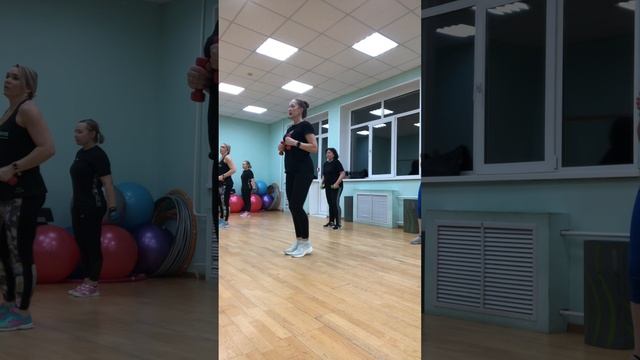 Тренировка выполняется с гантелями по 1 кг. или без гантелей. Выбирайте для себя нагрузку по возможностям. Так же можно чередовать нагрузку, работая с гантелями и работая без гантелей. Вес не более 1 кг., так как движения руками выполняются в динамичном темпе. Как раз руки с гантелями устают больше, на ноги нагрузка меньше, хотя тоже присутствует дополнительный вес. И в связке получается работа на руки, плечи; спину; ноги; и добавлено кардио. Не сразу всё, а поочерёдно идет нагрузка на определенные части тела. Так что и всё тело поработало, и попрыгали) На ковриках пресс. Всем отличных результатов!