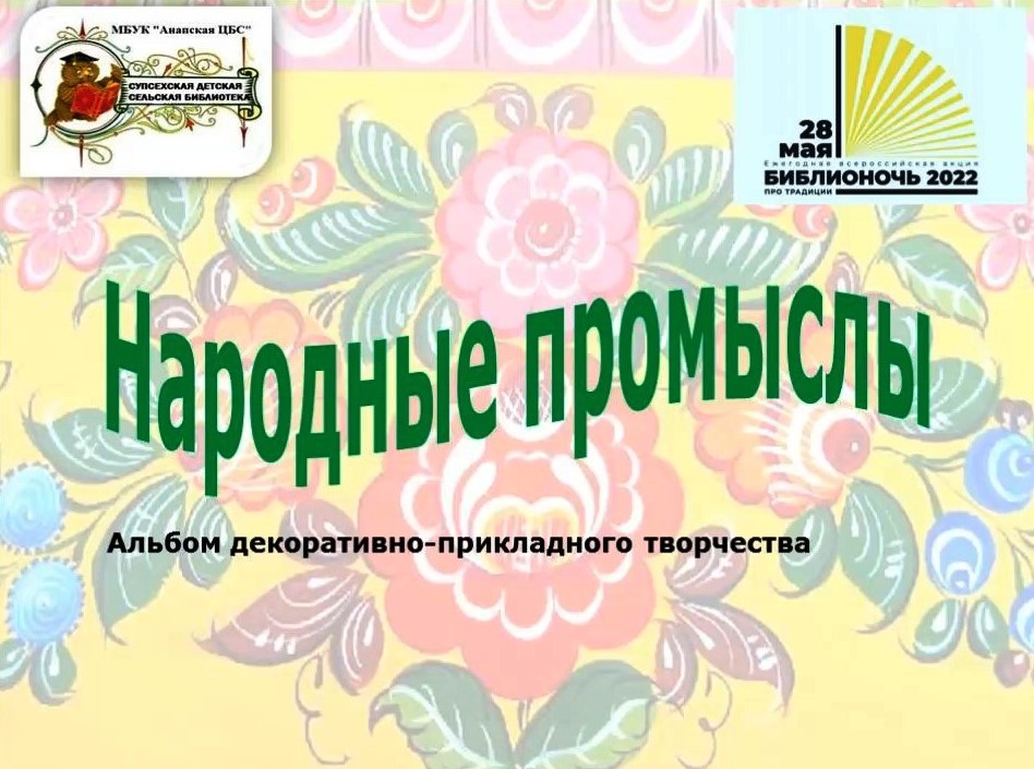 К Году культурного наследия народов России и в рамках ежегодной акции Библионочь Супсехская детская библиотека-филиал №28 подготовила альбом декоративно-прикладного искусства «Народные промыслы». Библиотекарь Супсехской детской библиотеки-филиала №28 МБУК «Анапская ЦБС» Е.Е. Константинова