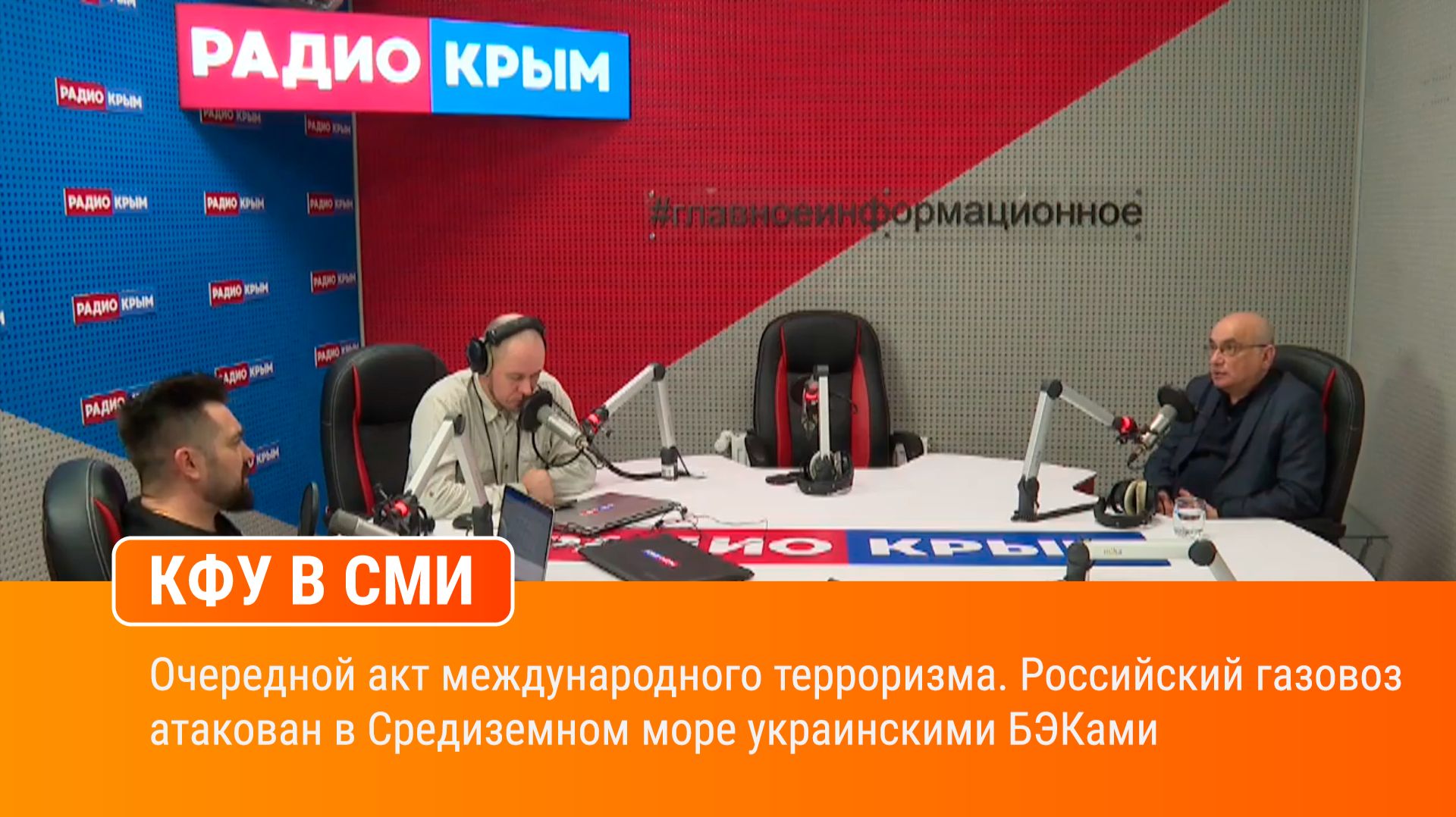 Радио «Крым». В эфире – профессор кафедры философии КФУ им. В. И. Вернадского Олег Габриелян Тема эфира – «Вечер.18+» Очередной акт международного терроризма. Российский газовоз атакован в Средиземном море украинскими БЭКами.