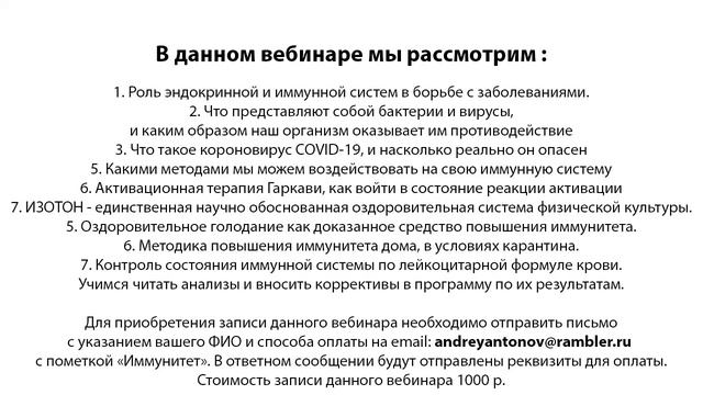 Дорогие друзья! Напоминаю вам, что посмотреть вебинары вы сможете только до 19.06.2020 (аренду платформу продлил один из подписчиков). После этого срока я перехожу на другую платформу для проведения вебинаров и они будут недоступны. Вашему вниманию представлен отрывок из вебинара: "Повышение иммунитета физиологическими (нелекарственными) методами. Активационная терапия, ИЗОТОН и оздоровительное голодание против пандемии". В данном вебинаре мы рассмотрим следующие вопросы: 1. Роль эндокринной и иммунной систем в борьбе с заболеваниями. 2. Что представляют собой бактерии и вирусы, и каким образом наш организм оказывает им противодействие 3. Что такое короновирус COVID-19, и насколько реально он опасен 5. Какими методами мы можем воздействовать на свою иммунную систему 6. Активационная терапия Гаркави, как войти в состояние реакции активации 7. ИЗОТОН - единственная научно обоснованная оздоровительная система физической культуры. 5. Оздоровительное голодание как доказанное средство повышения иммунитета. 6. Методика повышения иммунитета дома, в условиях карантина. 7. Контроль состояния иммунной системы по лейкоцитарной формуле крови. Учимся читать анализы и вносить коррективы в программу по их результатам. Андрей Владимирович Антонов. Руководитель сектора научной лаборатории спортивной адаптологии, редактор рубрики "Наука и спорт" журнала "Железный Мир", тренер высшей категории, МСМК, чемпион мира по армрестлингу, автор 3-х книг и более 150 статей. Консультант сборной команды Болгарии по карате кёкусинкай (2017г). Для приобретения записи вебинара необходимо отправить письмо с указанием ФИО участника и способа оплаты на адрес andreyantonov@rambler.ru с пометкой «Иммунитет». В ответном сообщении будут отправлены реквизиты для оплаты. Стоимость записи одного вебинара 1000 р. После получения оплаты, вам будет отправлена персональная ссылка, пройдя по которой вы сможете посмотреть запись вебинара. Не передавайте данную ссылку третьим лицам и нигде не размещайте её, так как по одной ссылке возможно только одно подключение. Вам будет предоставлена возможность посмотреть его запись неограниченное количество раз в течении 10 суток. Следите за новостями о предстоящих вебинарах в моей группе в ВК: https://vk.com/nk_sport Также сообщаем, что в наличии имеются записи предыдущих вебинаров: 1. "Лечебное голодание для избавления от лишнего жира. Новые данные" 3ч 52мин 2. "Жиросжигание. Как снизить количество жировой массы и не набрать ее вновь" 3ч 15мин 3. "Как стать большим, или научный подход к набору мышечной массы" 3ч 58мин 4. "Физиология мышления и основы позитивного мышления в спорте и оздоровительной физической культуре", совместно с директором Научно-практического института физиологии мышления А. Б. Николаевым. 3ч 30мин 5. "Физическая п