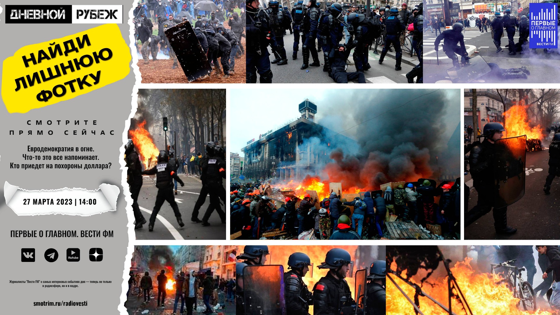 #дневнойрубеж #первыеоглавном #сво #донбасс #спецоперация #украина #путин #ядерноеоружие #белоруссия #упц #вооружение #сша #америка #протесты #европа #франция #израиль #киевопечерскаялавра #миссисипи #доллар #разуваев #тэйлоргрин #байден #майдан #оон #патрушев Евродемократия в огне. Что-то это все напоминает. Кто приедет на похороны доллара? ?Подписывайтесь на Telegram канал - Первые о главном: https://t.me/vestifmfirst ?Подписывайтесь на Rutube канал - Первые о главном: https://rutube.ru/channel/24115140/ ?Подписывайтесь на VK канал - Первые о главном: https://vk.com/first.vestifm ?Подписывайтесь на ДЗЕН канал - Первые о главном: https://zen.yandex.ru/id/5fc4960a799d1b24b5be5189 ?Подписывайтесь на Telegram канал - ВестиFM+: https://t.me/s/vestifmplus СМОТРИТЕ НАС НА ПЛОЩАДКЕ СМОТРИМ: https://smotrim.ru/channel/365