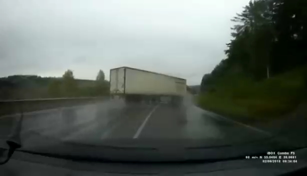 Водитель фуры справился с заносом на мокрой дороге. #фура #занос #прицеп #мокраядорога