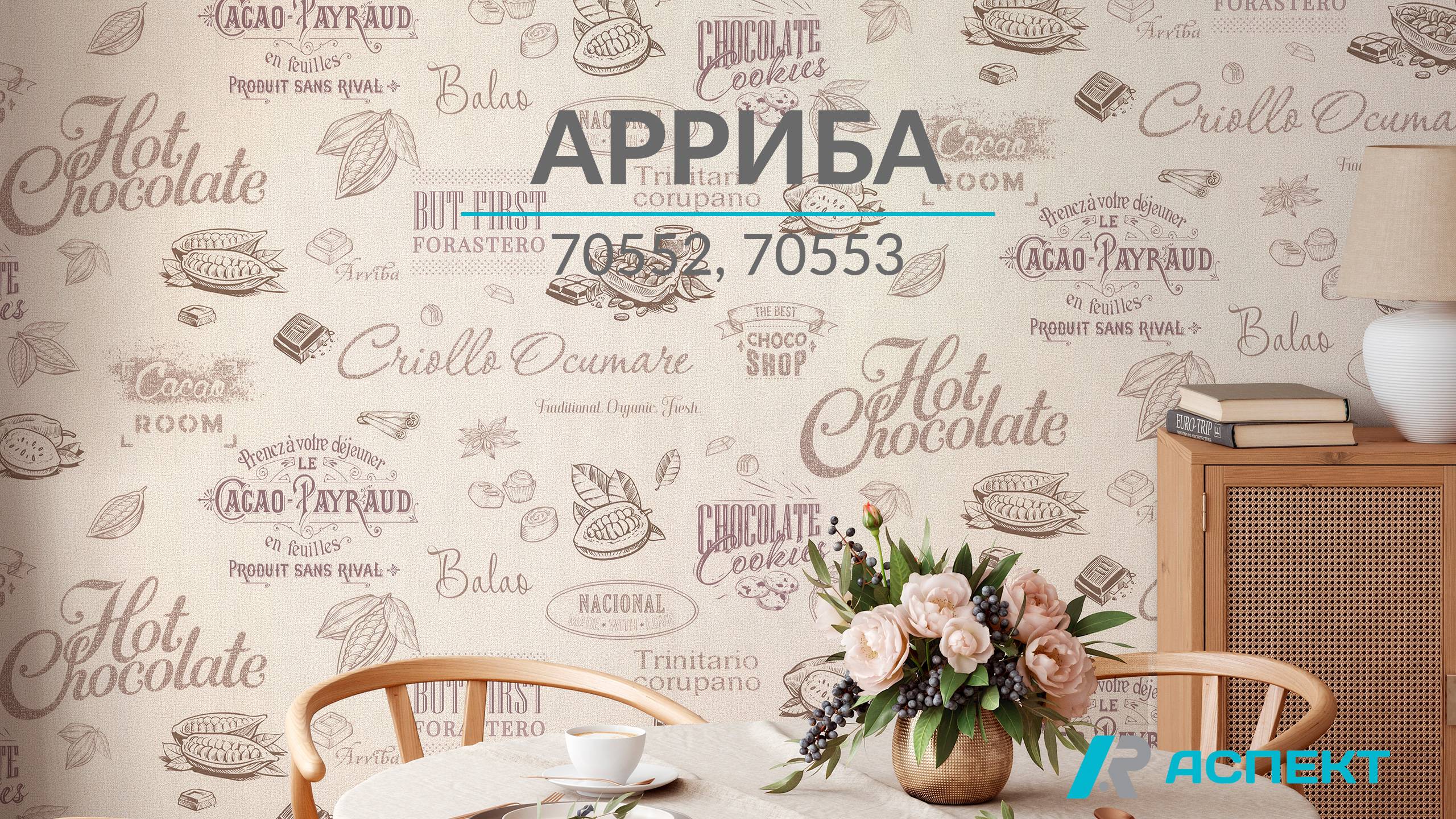 Коллекция «Арриба» изготовлена в технике горячее тиснение. Имитация текстиля и пастельные колористики создадут ощущение комфорта. Главное полотно с рисунками и надписями придаст интерьеру неповторимый шарм и станет акцентным мотивом. Однотонный фон создаст плавный переход от основного рисунка и будет отлично смотреться с различными элементами декора. Дизайн с изображением кофе и какао-бобов становится всё более популярным в современных интерьерах. Чаще всего его используют в оформлении кухонь и прихожих. «Арриба» – стильная и качественная коллекция обоев по доступной цене.