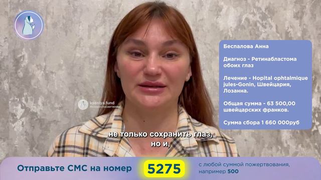 Друзья, у нас открыт новый сбор. РАК уже поразил оба глазика и теперь идёт обратный отсчёт. Поддержите жизнь Анюты! Наша новая подопечная, двухлетняя кроха Аня, любимая дочь в многодетной семье. РАК отобрал её счастливое детство, и теперь семья с пятью детками в отчаянии пытается спасти кроху Анечку. Так как девочка совсем ещё маленькая, она не чувствовала, что с ней что-то не так. Была активной, жила и радовалась, не замечая никакого дискомфорта, пока РАК продолжал прогрессировать внутри неё. И это было очень жутко... Болезнь успела поразить оба глазика девочки и стремится отобрать её жизнь! Помогите пожалуйста этой маленькой девочке выжить и стать здоровой! Малышке некуда деваться, Анечке очень страшно! Анна Беспалова, 2 года, г. Комсомольск-на-Амуре. Диагноз: Ретинобластома обоих глаз. Необходимо: Лечение в Hospital Ophtalmique Jules-Gonin, Швейцария. Сумма сбора: 1 660 000 руб. Страница Анечки на сайте: https://kseniya.fund/komu-pomoch/anna-bespalova/?FAND=rutube "Мы очень ждали нашу пятую малышку и не могли себе представить, что её постигнет такая ужасная болезнь. Вся семья в отчаянии. Мы пытаемся делать, что можем, что в наших силах, но кажется, что против РАКа мы бессильны. На родине нашей малышке предложили бы удалять глазки, чтобы спасти жизнь. Ретинобластома способна добираться по зрительному нерву прямо в мозг и уничтожать всё живое... Мы будем защищать нашу доченьку до последнего и не отдадим её РАКу. Нам очень нужна Ваша помощь и поддержка, чтобы оплатить лечение, которое спасёт ей и жизнь, и глазки. Трудно думать о том, что наша крошка недостойна того, чтобы жить под небом и радоваться, как и все детки, недостойна расти и улыбаться. Очень больно понимать, что её жизнь находится на грани и вот-вот оборвётся! Нам очень нужно успеть её спасти! К сожалению, без вас мы не сможем ничего. Это спасительное лечение непосильно для нас. Сумма просто астрономическая. Но разве кто-то из родителей бы отдал своего ребенка на съедение РАКу? И мы не можем на это пойти. Мы очень любим нашу Анютку. И больше всего на свете мечтаем, чтобы она выжила, снова улыбалась, была здорова, выросла, стала бы ходить в детский садик, в школу, играть с другими ребятами и просто жить в своём счастливом детстве. Мы умоляем вас о помощи! Против РАКа мы безоружны. Пожалуйста, помогите нам спасти нашу маленькую Анечку!" Мама Ани Беспаловой. Выберите удобный способ пожертвования у нас на сайте: https://kseniya.fund/komu-pomoch/anna-bespalova/?FAND=rutube Отправьте СМС: - на номер 3434 со словами «Лечим Аню» и любой суммой. Пример: Лечим Аню 300 - на номер 5275 и с любой суммой пожертвования. Пример: 300 Банковские реквизиты: Получатель платежа: Благотворительный фонд «Ксения Спасает Жизни» ИНН 7814779325 КПП 781401001 ОГРН 1207800101497 ПАО «Сбербанк» Р/с 40701810755000000688 Банк: Северо-Западный банк ПАО Сбербанк БИК: 044030653 К/с 30101810500000000653 Назначение платежа: Благотворительное пожертвование для Анны Беспаловой. #помощь #ракуходи #КомсомольскнаАмуре #доченька #семья #моядевочка #малышка #ксенияспасаетжизни