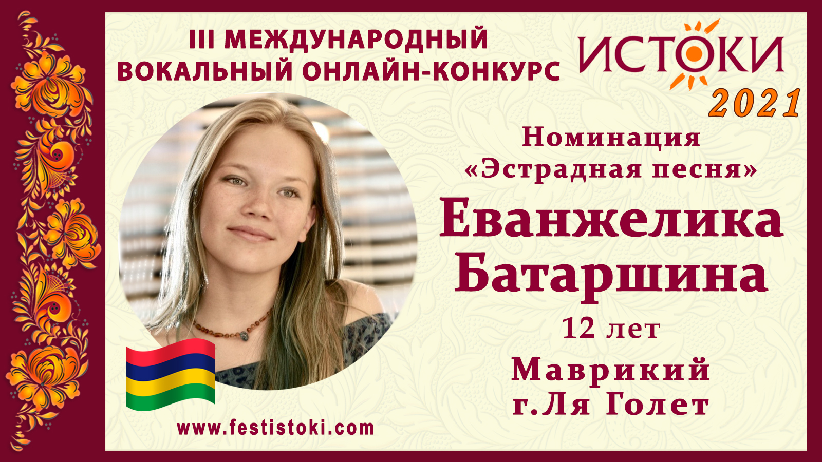 Лауреат II степени III Международного вокального онлайн-конкурса «Истоки». Номинация "Эстрадная песня". Песня "The Joke". Авторы Brandi Carlile, Dave Cobb, Phil Hanseroth, Tim Hanseroth. Сайт: www.festistoki.ru / www.festistoki.com E-mail: festistoki@mail.ru
