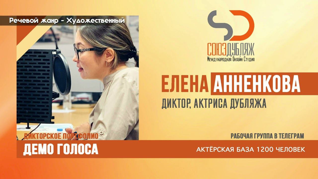 #СоюзДубляж #БазаДикторов #Озвучка ✔️Елена Анненкова, диктор озвучивания. Международная Онлайн-Студия "СОЮЗДУБЛЯЖ" - профессиональная озвучка и дубляж. ▪️Рабочая группа в Телеграм: https://t.me/soyuzdubliazh ▪️Контакт для связи: https://t.me/SoyuzAdmin ▪️Подпишись:https://www.youtube.com/c/SOYUZDUBLIAZH ▪️Сайт: https://www.soyuzdubliazh.com/ Лучшие голоса для вашей аудиорекламы и видеороликов. База дикторов - 5 000 человек, профессионального уровня на ENG| FR| TR| RU| ISR| AZ| UA| KZ| UZ| языках. Мужские и Женские топовые голоса для озвучки любых проектов, таких как: Рекламы, Презентации, Фильмы, Сериалы, Игры, Мультфильмы, ТВ Шоу, Аудио-видео визитки. ✔️Сотрудничая с нами вы получаете свой проект под ключ, не выходя из дома или офиса. Наша слаженная команда из лучших дикторов, актёров озвучивания, режиссёров и звукорежиссёров в кратчайшие сроки озвучат или отдублируют ваш заказ на профессиональном уровне. Образцы работ нашего портфолио вы сможете посмотреть на канале СОЮЗДУБЛЯЖ. ВНИМАНИЕ: ✔️Мы приглашаем специалистов озвучки к сотрудничеству в нашей команде. Вы можете пройти по ссылке в наш телеграм канал и связаться с Админом для обсуждения. ✔️Всем заказчикам подобных медиа проектов по озвучки и дубляжу фильмов, сериалов, документалок обращаться непосредственно к Админу Телеграм группы СОЮЗДУБЛЯЖ, пройдя по ссылке: Проходи по ссылке: https://t.me/soyuzdubliazh International Online-Studio SOYUZDUDLIAZH presents a highly professional approach in voice-over and dubbing. ▪️Our working group https://t.me/soyuzdubliazh ▪️Chief manager https://t.me/SoyuzAdmin ▪️Follow https://www.youtube.com/c/SOYUZDUDLIAZH ▪️Web: https://www.soyuzdubliazh.com/ We offer You the best Voices for your Audio commercials and Video`s. Our Database contains over 5 000 voices of native speakers and high-class foreign language specialists in ENG| FR| TR| RU| ISR| AZ| UA| KZ| UZ|. Male & Female top level voices for all the variety of dubbing projects such as commercials, presentations, movies, TV-series, video and computer games, cartoons, TV-shows, audio & video portfolio’s – all in one place. As your business partner we guarantee a turn-key project without you leaving your house or office. Our target is to make sure that the dubbing of your project is made as quick as possible by a well-coordinated and professional team of the best speakers, film and sound directors. To whom it may concern! We invite dubbing specialists to join our team. Please contact our manager on Telegram https://t.me/soyuzdubliazh
