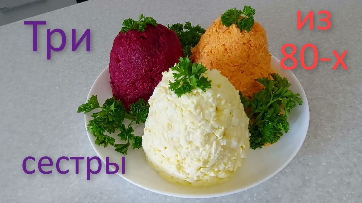 Салат Три сестры. Салат из моей молодости, из советского прошлого. Это три очень простых и вкусных салата. Рецепт: Свёкла 700 гр. (500 гр. уже варёной) чеснок 10 гр. соль, сахар по - вкусу майонез 2 ст. л. Морковь сырая 500 гр. чеснок 10 гр. майонез 4 ст. л. Яйца 3 шт. сырки плавленые 3 шт. чеснок 10 гр. майонез 3 ст. л. Готовьте с удовольствием!