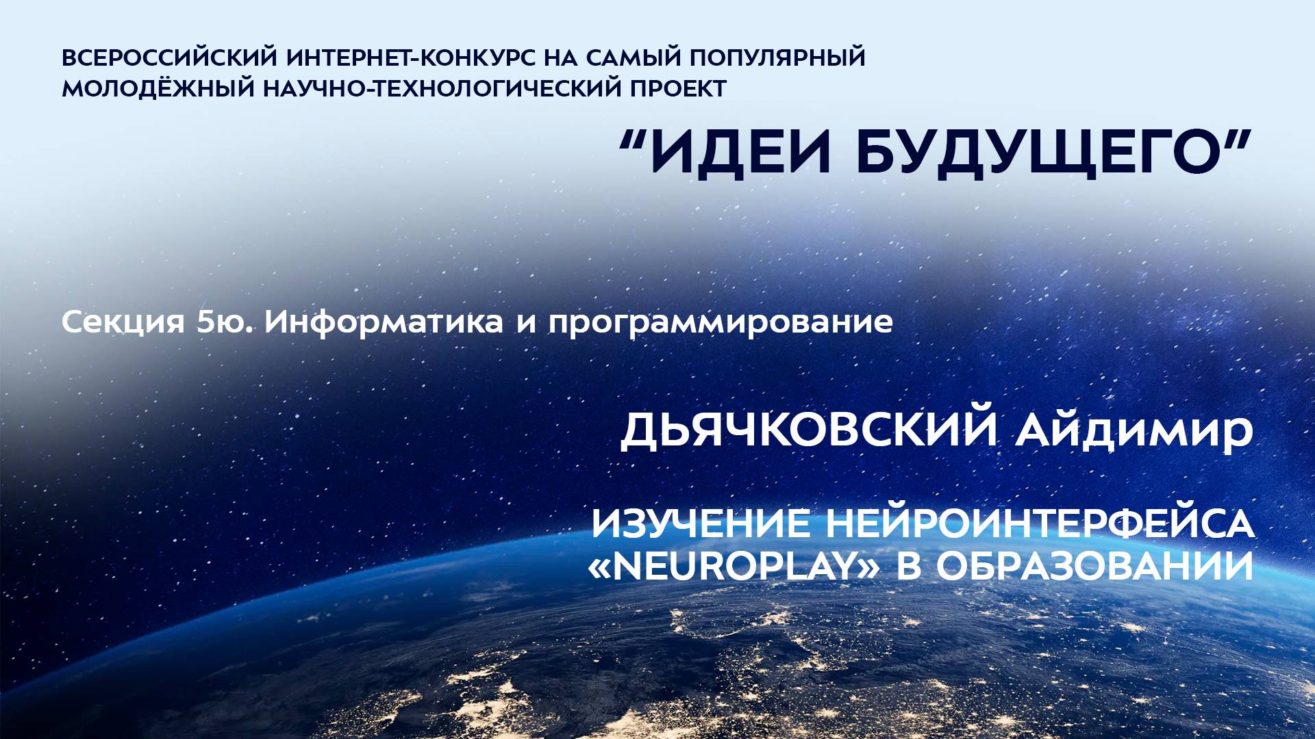 (5Ю-10) ДЬЯЧКОВСКИЙ Айдимир Михайлович Республика Саха (Якутия), п. Нижний Бестях МБОУ «Нижне-Бестяхская СОШ №2 с УИОП», 7 класс ИЗУЧЕНИЕ НЕЙРОИНТЕРФЕЙСА «NEUROPLAY» В ОБРАЗОВАНИИ Научные руководители: Дьячковская Инна Алексеевна, Республика Саха (Якутия), п. Нижний Бестях, ГАПОУ РС(Я) «Якутский педагогический колледж им.С.Ф. Гоголева», преподаватель, Сорочинский Максим Анатольевич, Республика Саха (Якутия), г. Якутск, «ЦОиТ»ПИ СВФУ им.М.К. Аммосова, доцент кафедры, кандидат педагогических наук Более подробно о мероприятиях Программы "Шаг в будущее" можно узнать на сайтах http://www.step-into-the-future.ru/ и http://шагвбудущее.рф