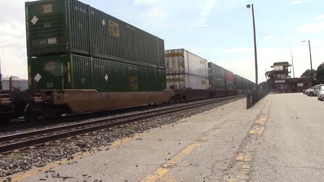 Мощные американские тепловозы тянут очень тяжелые грузовые составы по железной дороге в Америке