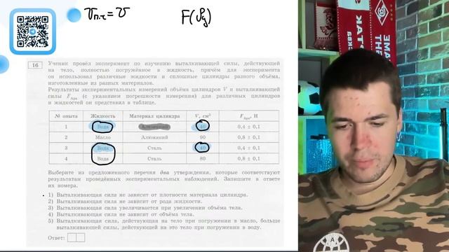 Ученик провёл эксперимент по изучению выталкивающей силы, действующей на тело, полностью - №20302