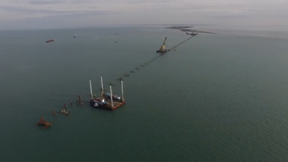 19 октября 2015 года на месте будущего моста, который соединит Краснодарский край и Крым, уже можно наблюдать сваи и грунтовые дороги. Процесс строительства идет полным ходом.