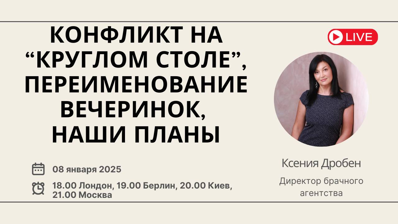 Сегодня у нас среда, и, значит, мы встречаемся на открытом вебинаре Сегодняшние темы: Конфликт на последнем «Круглом столе», новая версия вечеринок знакомств в Германии, наши планы на будущее. Если вы не можете присутствовать лично, то вебинар можно будет посмотреть в записи Вебинар «Конфликт на «Круглом столе» состоится сегодня, в среду 8 января Время: 18.00 по Лондону, 19.00 по Берлину, 20.00 по Киеву, 21.00 по Минску и Москве Место проведения: Где: RuTube - https://rutube.ru/channel/24748934/ YouTube Ksenia Droben https://www.youtube.com/@KseniaDrobenPartnervermittlung Страница Facebook https://www.facebook.com/ksenia.droben Женская группа Facebook https://www.facebook.com/groups/datingmarriageagency VK https://vk.com/kseniadroben Instagram https://www.instagram.com/kseniadroben/ - @kseniadroben Tiktok: @kseniadrobendating Буду рада увидеться с вами и ответить на ваши вопросы Наши ближайшие мероприятия: 18 января – Dating Event Hamburg https://droben-partnervermittlung.de/ru/hamburg-dating-party-ru/ 25 января – Онлайн вечеринка знакомств https://droben-partnervermittlung.de/ru/dating-event-zoom/ 9 февраля – Круглый стол на английском языке https://droben-partnervermittlung.de/ru/round-table/ 14 февраля – YouTube/ RuTube вечеринка знакомств https://droben-partnervermittlung.de/ru/youtube-single-dating-event/ С уважением Дробен Ксения Директор международного брачного агентства www.droben-partnervermittlung.de Whatsapp +4915203663653