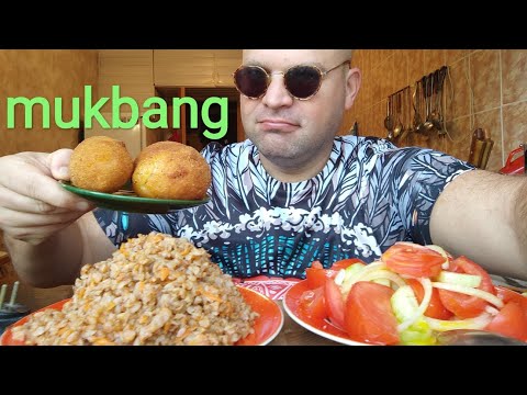 МУКБАНГ ГРЕЧКА по купечески и котлеты по киевски/ОБЖОР салат из помидоров и огурцов