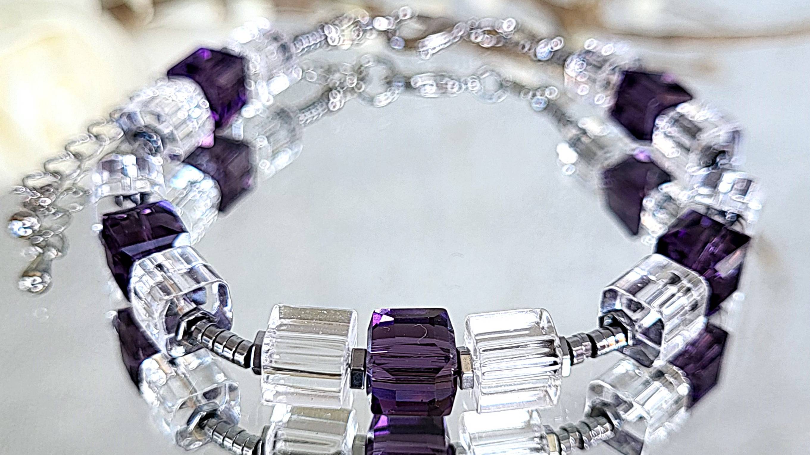 Комплект украшений из хрусталя (не является горным хрусталем). Браслет, серьги из хрусталя: хрусталь кубик с гранями 8 мм., гематит диск 2,3 мм.. Серьги швензы покрытие родий, длина до швензы 35 мм., все пары 7 гр., браслет длина 18-24 см. (на запястье от 15 см.)