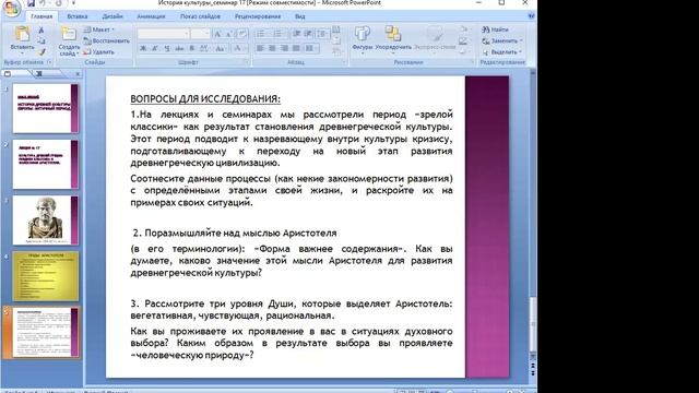 семинар по лекции № 17 «Культура Древней Греции: поздняя классика и философия Аристотеля». Лектор - Атаманова Л.Г. Вопросы и отклики просим оставлять в комментариях к видео, также Вы можете связаться с нами по тел. 8(903)016-95-32 Ирина Федоровна.