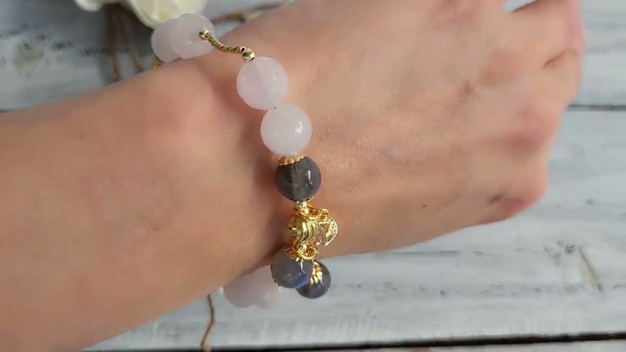 Браслет украшения из натуральных камней. Браслет из розового кварца, лабрадора с подвесками: розовый кварц шарик 10 мм. ювелирная огранка, лабрадор шарик 10 мм., фурнитура люкс покрытие золото 14 к., длина 18-22 см. (на запястье от 14 см.) купить украшения можно в нашем магазине https://www.livemaster.ru/samotsvety-ot-granat-mk?view=profile