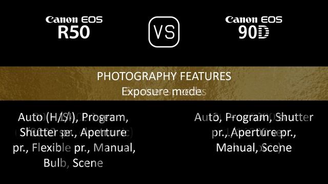 This video overviews the Canon EOS R50 and the Canon EOS 90D in a parallel comparison of specifications. Thanks for watching. If you liked this video and found it informative, make sure to subscribe for more. 00:24 LAUNCH 00:32 BODY 00:41 SENSOR 01:05 IMAGE 01:21 OPTICS & FOCUS 01:50 SCREEN 02:10 VIEWFINDER 02:26 PHOTOGRAPHY FEATURES 03:27 VIDEOGRAPHY FEATURES 03:43 STORAGE 03:47 CONNECTIVITY 04:16 PHYSICAL 04:36 MISC