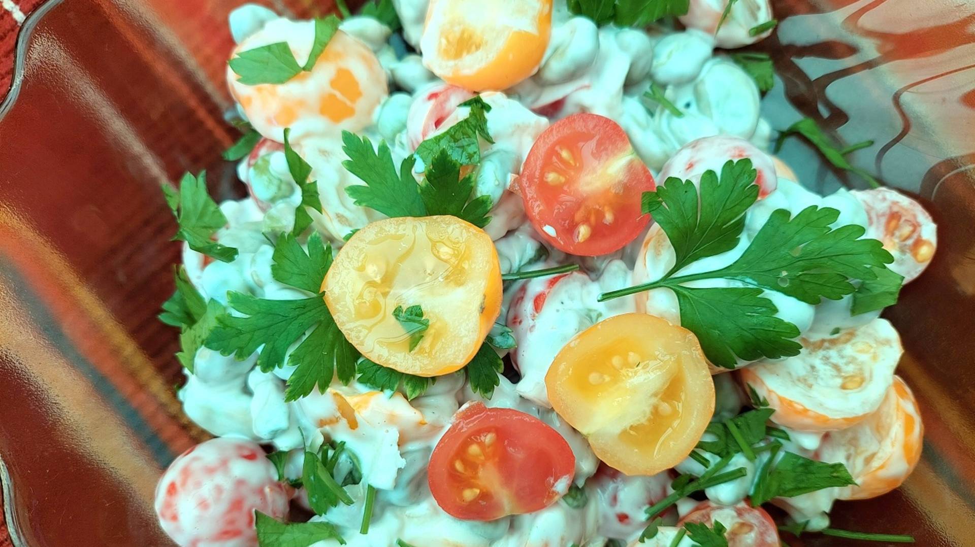 Салат с отваренными бобами и разноцветными помидорами черри. Игра красок и вкусов.