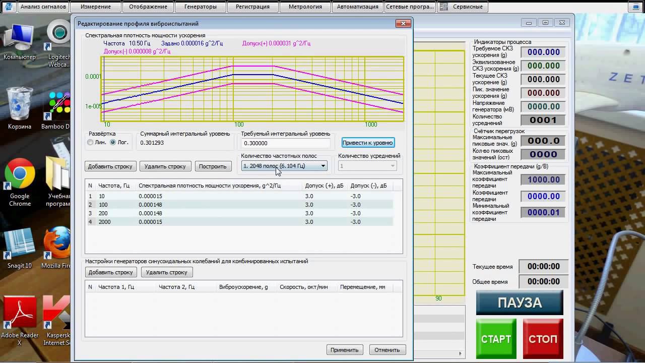 Настройка и запуск виброиспытаний методом широкополосной случайной вибрации на системе управления виброиспытаниями ZETLAB.