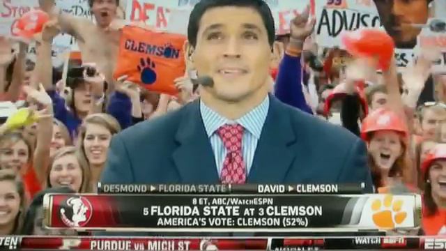 Clemson Fan Dancing behind David Pollack at ESPN College Gameday at Clemson, SC FSU v. Clemson Lee Corso, Kirk Herbstreit, Desmond Howard, Chris Fowler, David Pollack, Samantha Ponder, Tom Rinaldi
