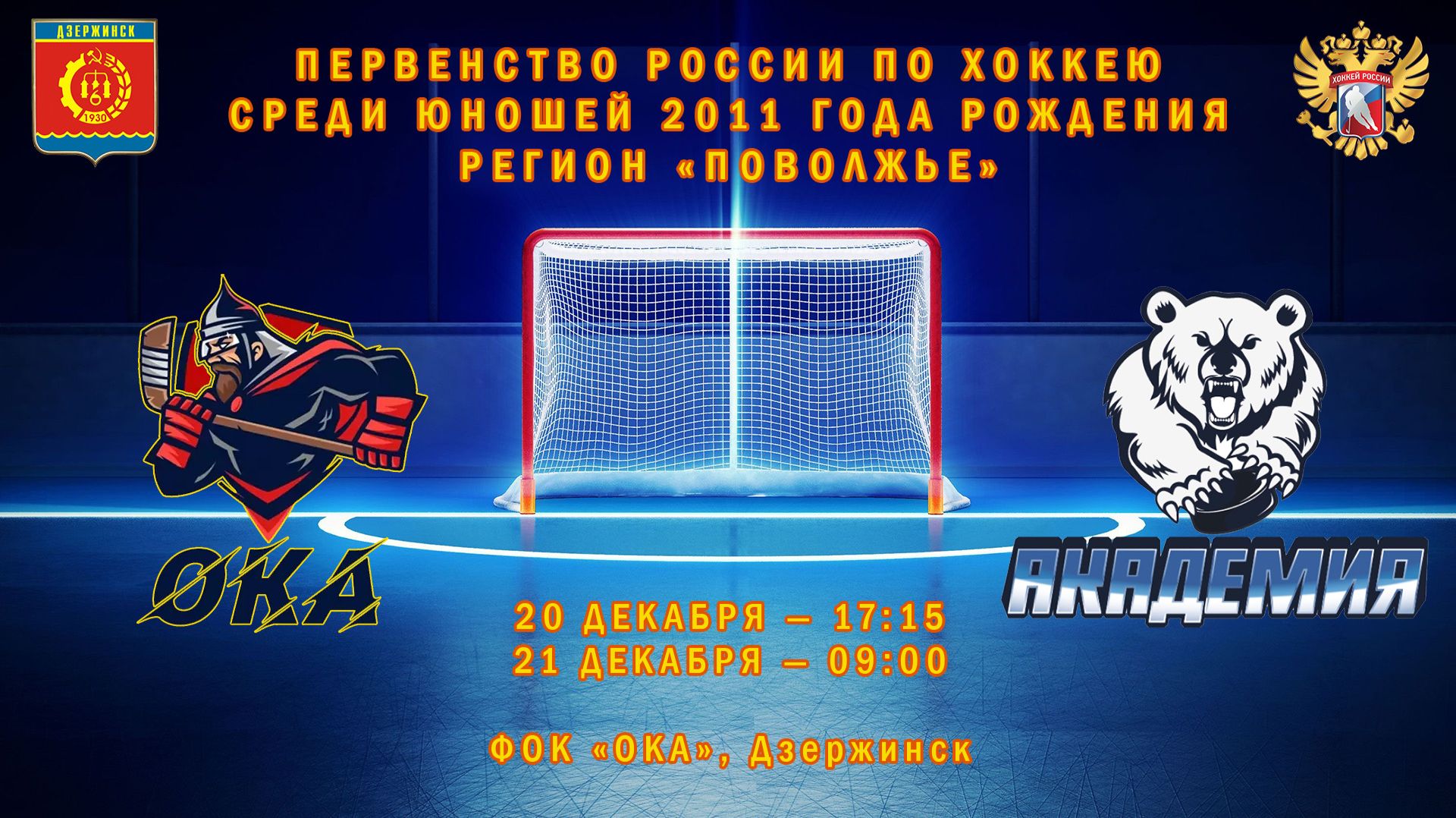 21 декабря 2025 года. Дзержинск, Нижегородская область. ФОК "Ока". Матч Первенства России по хоккею среди юношей 2011 года рождения по Приволжскому Федеральному округу. "Ока" (Дзержинск, Нижегородская область) – "Академия" (Усть-Кинельский, Самарская область). Начало матча – в 9:00.