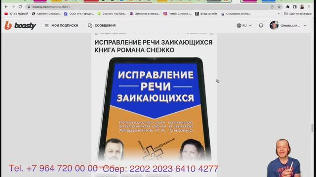 Сайт www.romansnezhko1.com ☎️Телефон +7 964 720 00 00 Избавиться от заикания легко вместе с Романом Снежко 00:00:09 Введение и контакты • Приветствие и представление академика Романа Снежко. • Упоминание о его канале на Дзене и других платформах. • Контактная информация для связи с Романом. 00:01:33 Вопросы и ответы • Обсуждение комментариев на канале Дзен. • Вопрос о правильности слова "заикающийся". • Переход на другой канал для вопросов по другим темам. 00:03:47 Личный опыт и методы • Личный опыт Романа в борьбе с заиканием. • Описание метода привыкания к речевому эталону. • Объяснение, как осознание законов речи помогает избавиться от заикания. 00:05:41 Причины заикания • Заикание как материальная причина. • Необходимость исправления поведенческих шаблонов. • Важность осознания причин заикания. 00:07:31 Практические занятия • Описание практических занятий по балансировке речи. • Разблокировка сознания и замена неправильных убеждений. • Исключение страха перед речью и общением. 00:08:46 Рекомендации и книги • Рекомендация книги "Исправление речи заикающихся". • Важность информированности и знаний по теме заикания. • Личный опыт Антона Никоненко в борьбе с заиканием. 00:12:03 Эталон речи • Объяснение понятия эталона речи. • Сравнение эталона с современным высокотехнологичным автомобилем. • Примеры успешного применения эталона в школе Романа. 00:15:30 Заключение • Старые привычки забываются, новые развиваются. • Денис, следующий вопрос и обсуждение. 00:15:55 Переход от заикания к нормальной речи • Переход от заикания к нормальной речи занимает три дня. • Существуют две программы: для умных и для не очень умных людей. • Программа для умных людей короче и дешевле, для не очень умных - длиннее и дороже. 00:16:48 Различия в подходах к обучению • Умные люди привыкают быстрее, не очень умные - медленнее. • Некоторые люди ответственно подходят к избавлению от заикания, другие - нет. • Люди, которые не могут придерживаться плана, не могут избавиться от заикания. 00:20:25 Важность целеустремленности • Без четкой цели и плана заикание не преодолеть. • Важно быть активным и задавать вопросы на бесплатных занятиях. • Пассивность и ожидание помощи от других мешают избавиться от заикания. 00:22:18 Эстетика речи и самопрезентация • Заикание - это эстетическая проблема, как кривые зубы. • Люди с заиканием чувствуют стыд и повышенное внимание. • Заикание можно преодолеть, но это требует усилий и времени. 00:25:45 Причины заикания • Заикание - следствие человеческого невежества и разбалансированной речи. • Дети начинают заикаться из-за неправильного примера родителей. • Дети копируют речь родителей, и если она вызывает страх, это приводит к заиканию. 00:28:36 Самостоятельное обучение речи • Дети, на которых кричат, начинают заикаться. • Заикающиеся дети выдумывают свои методы речи, которые не работают. • Никто не преподает им эталонную речь, они учатся сами, что приводит к заиканию. 00:29:46 Копирование поведения • Животные и дети копируют поведение окружающих. • Заикание может передаваться через копирование. • В коллективе, где есть заика, другие дети могут начать заикаться. 00:31:45 Влияние коллектива • Коллектив может подавлять волю людей без четких принципов. • Слабовольные люди могут поддаться коллективному влиянию. • Заикание часто передается через копирование поведения. 00:34:36 Проблемы 