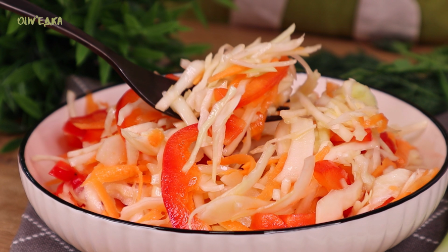 ?Ингредиенты: Капуста белокочанная: 500г Красный болгарский перец: ½ шт Морковь: 150г Заправка: Растительное масло: 40г Уксус: 20мл Соль: 1 ч.л без горки Сахар: 1 ст.л без горки