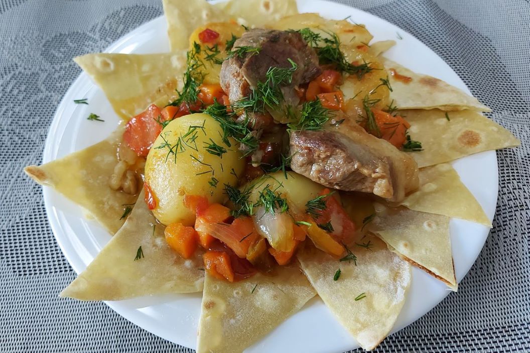 Баранина с овощами. Очень вкусно, хотя и жирно, поэтому подаём к этому блюду побольше свежих овощей и зелени. Подать на кусочках лаваша, который пропитается вкуснейшим соком. Рецепт: баранина 700 гр. картошка 1 кг. помидоры 260 гр. перец сл. 100 гр. (очищенного) лук 130 гр. морковь 150 гр. масло растительное. Готовьте с удовольствием.