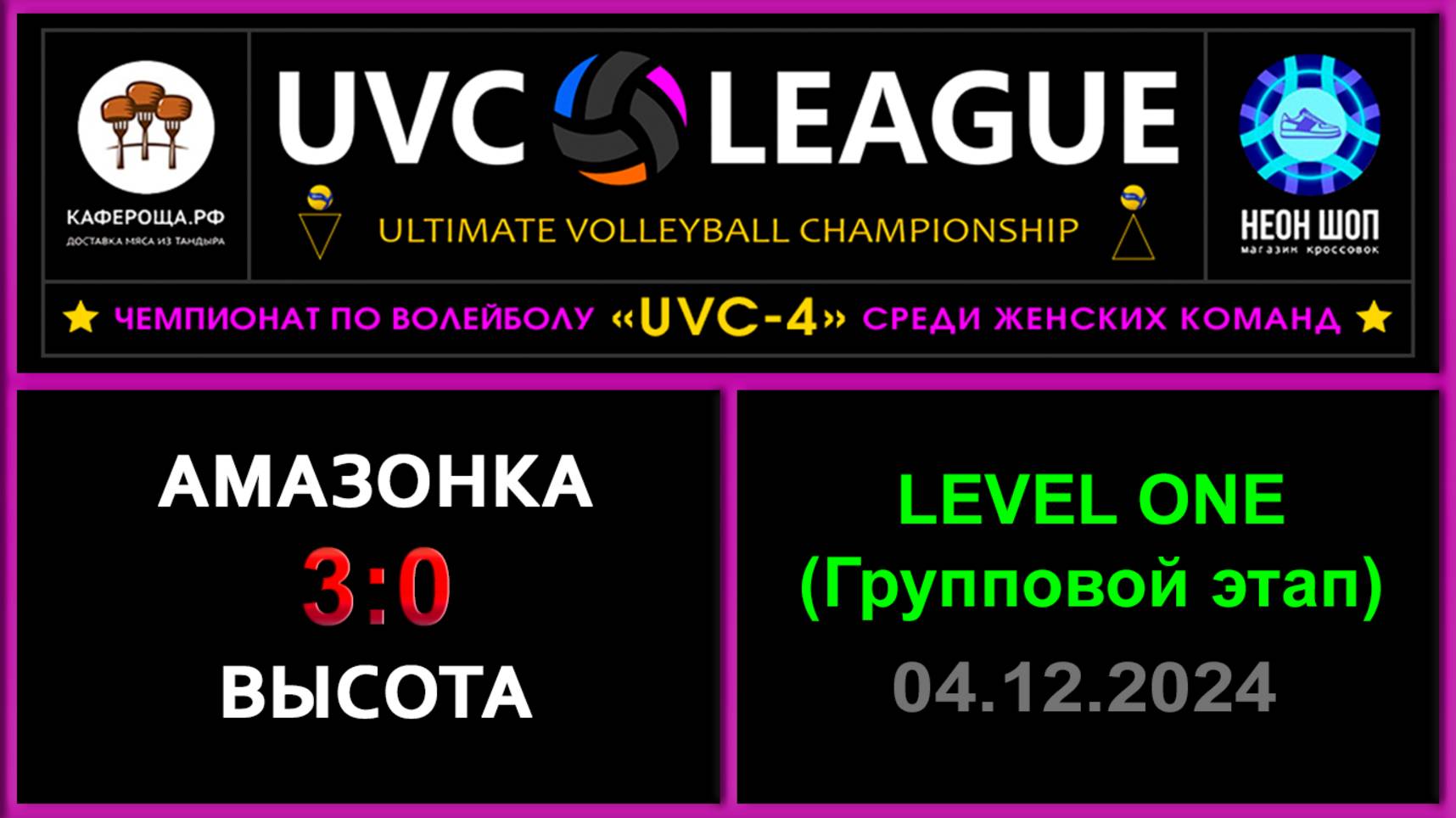 UVC-4 (Девушки): Чемпионат UVC Лиги по волейболу среди женских команд 2024-2025 гг. Результаты игры: LEVEL ONE (Групповой этап) 04.12.2024 Амазонка - Высота 3:0 (25:17, 25:20, 25:13) Конкурс «Робин Гуд»: ⛔Точных попаданий не было! #UVC_ЛИГА_ЧЕМПИОНАТ_UVC_4_Девушки