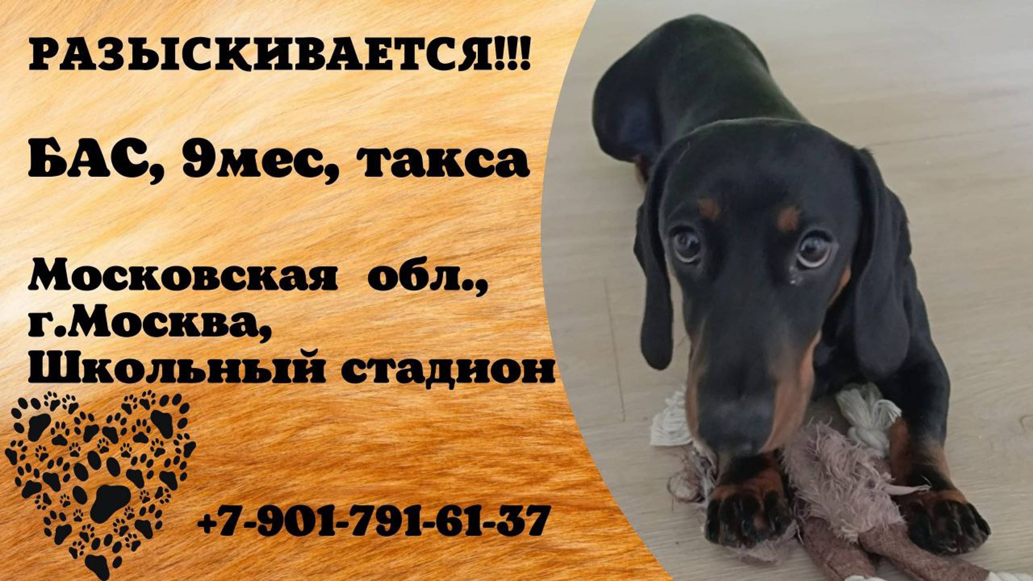 Московская Москва Пропала собака Пропала собака!! В этот понедельник 4.08 около 21:00 в районе Школьного стадиона убежал щенок таксы, мальчик, откликается на кличку Бас, Бася, 9 мес, черный, с подпалами, чипирован, сорвался с поводка (поломался ошейник). Если видели его или нашли, свяжитесь пожалуйста по телефону +79017916137, Елена Или со мной в лс здесь 🙏🙏 Инфо https://vk.com/wall-198815410_206834 #пропала_собака #московская#москва