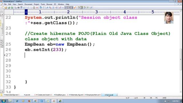 #Hibernate #insert one #record and #retrieve the same to console using #Oracle #Database #Create Hibernate application to insert one record and retrieve the same to console using Oracle Database: Here im using hibernate-distribution-3.6.5.Final-dist JDK 1.8 Oracle Database 10 Create Table (Employee) Open SqlPlus create table employee(eid number(5)primary key,firstname varchar(20),lastname varchar(20),email varchar(25)); Create the Project Folder "HibApp" Step 1) Create Bean Class (EmpBean.java) Step 2) configuration file (hibernate.cfg.xml) Oracle DB related Properties For Doctype search for *.cfg.xml in downloaded dist folder open any .cfg.xml file using editor and simply copy paste !DOCTYPE of that configuration file Step 3) mapping file (Empolyee.hbm.xml) to map Pojo class with Database table For Doctype search for *.hbm.xml in downloaded dist folder open any .hbm.xml file using editor and simply copy paste !DOCTYPE of that hibernate mapping file Step 4) Client java application (TestClient.java) Step 5) Download hibernate-distribution-3.6.5.Final-dist.zip file from https://sourceforge.net/projects/hibernate/files/hibernate3/3.6.5.Final/ extract to your preferred location Following Jars Need to be added to the classpath -hibernate3.jar; -antlr-2.7.6.jar; -commons-collections-3.1.jar; -dom4j-1.6.1.jar; -javassist-3.12.0.GA.jar; -jta-1.1.jar; -slf4j-api-1.6.1.jar; -hibernate-jpa-2.0-api-1.0.0.Final.jar; c:\oracle\product\10.2.0\db_1\jdbc\lib\ojdbc14.jar; 9 Jars Right CLick on My COmputer Select Properties CLick on Advanced System Settings Go to Advanced Tab Hit the Environment Variable Button add the above jars seperated by ; to the classpath Step 6) Compile .java files Error Occured So type cast to EmpBean like EmpBean eb1=(EmpBean)ses.load(EmpBean.class,233); Save the TestClient.java Then recompile .java file Successfully compiles Step 7) Run the TestClient application java TestClient //Proof of interface implemented class public final class SessionFactoryImpl implements SessionFactory, SessionFactoryImplementor { public final class SessionImpl extends AbstractSessionImpl implements EventSource, org.hibernate.classic.Session, org.hibernate.jdbc.JDBCContext.Context, LobCreationContext { /* member class not found */ class LockRequestImpl {}