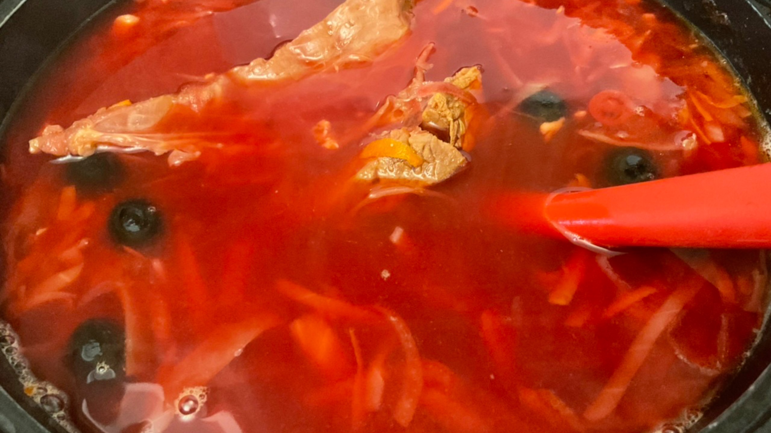 3 литра воды 1 килограмм говяжьих рёбер 100 грамм сухой фасоли,замочить на ночь,перед варкой борща,или на несколько часов минимум 2 лавровых листа Целый репчатый лук Щепотку сушёных лесных грибов Соль по вашему вкусу Варим 1,5 часа Добавляем половину кружки рассола с любых овощей Несколько минут на сухой сковородке зажариваем целую большую натертую свеклу Также целую морковь,половину лука,половину сладкого Чили и кетчуп(столовая ложка) Нарезаем половину маленького кочана белокочанной капусты 2 картофеля Добавляем и варим ещё 10 минут За 2 минуты до готовности добавить пассированные овощи и половину баночки маслин Выключите плиту и заправте борщ несколькими зубчиками давленного чеснока Приятного Аппетита Лайк,Ракета,Подписка🙏❤️