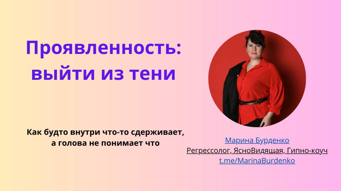 Кто из вас хоть раз хотел что-то сказать, но промолчал? «А вдруг критиковать начнут?» Хотел что-то сделать, но отложил: «А вдруг не получиться»? Хотел заявить о себе, но подумал: «А вдруг не так поймут?» Вот это и есть страх проявляться (непроявленность). И знаете, что самое интересное? Чем больше мы себя «глушим», тем меньше у нас денег. Досмотрите видео до конца, и вы узнаете что влияет на проявленность вообще. В конце практика, поале которой узнаете, что и кто конкретно влияет на вашу неуверенность и непроявленность, над чем вам нужно поработать. Напишите мне. и я вам помогу эти блоки убрать @Marina_gipnoz Марина Бурденко | Энергия и деньги t.me/MarinaBurdenko