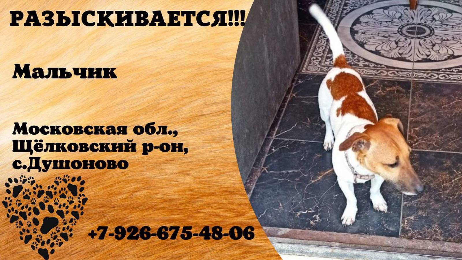 Московская Душоново Пропала собака Мальчик, возраст 10 мес, коричневый с рисунком ошейник, убежал из дома 03.09.2024 ориентировочно в 17:30, с. Душоново, Щёлковский район, Московская область, не на самовыгуле,прошу нашедших откликнуться и вернуть за вознаграждение. Замечен во Фрязино. Имя хозяина: Инна Телефон: +7 926 675-48-06 Адрес: Душоново, Московская область Инфо: https://vk.com/wall-198815410_151681