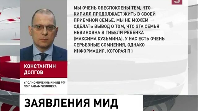 По словам Долгова, наших дипломатов не допускают до расследования смерти Максима Кузьмина. Приёмные родители мальчика до сих под подозрением, при этом они продолжают воспитывать его брата. Константин Долгов, уполномоченный МИД РФ по правам человека, демократии и верховенству права: «Мы очень обеспокоены тем, что Кирилл продолжает жить в своей приемной семье. Мы не можем сделать вывод о том, что эта семья невиновна в гибели Максима Кузьмина. У нас есть очень серьезные сомнения, однако информация, которая поступает из США, пока не дает российским правоохранительным органам провести собственное расследование». Высказался омбудсмен и по поводу Бредли Мэннига, к делу которого сегодня приковано огромное внимание. Как заявил Долгов, при вынесении приговора информатору Викиликс, американский суд вряд ли намерен рассматривать мнения правозащитников. Омбудсмен назвал это политикой двойных стандартов, ведь США всегда призывает уважать свободу слова и права человека – но на практике, по словам Долгова, это касается только других стран.