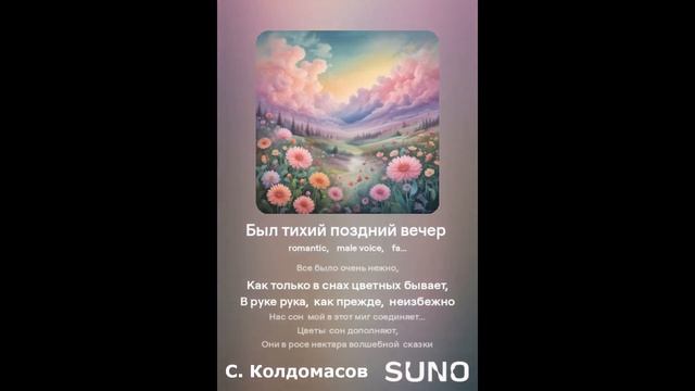 Романтика! Текст - С. Колдомасов Аудио и визуал - Suno AI Стихи: Сергей Колдомасов - "Был тихий поздний вечер" (2024/01/23) (на сайте стихи.ру). Никакой вульгарщины или пропаганды, все совпадения чисто совпадения!