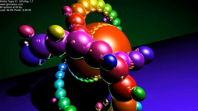 Latest version: https://www.youtube.com/watch?v=lG2p2X-Dgr8 Music: 1992 Amiga Oktalyzer module by Jan Wegger. Article here: http://www.ignorantus.com/gpu_hacks/ NVidia Tegra X1 Maxwell GPU at ~1ghz. 80 spheres, 3 reflections, non-reflective shadows on plane. All tracing done in a GLSL fragment shader, about 300 lines of code after unrolling.