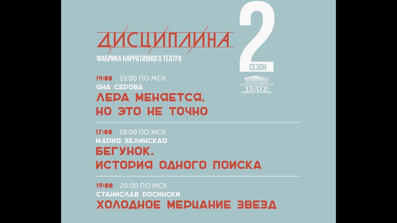 12 октября Читки современных пьес: 14:00 - "Лера меняется, но это не точно", 17:00 - "Бегунок. История одного поиска", 19:00 - "Холодное мерцание звезд".
