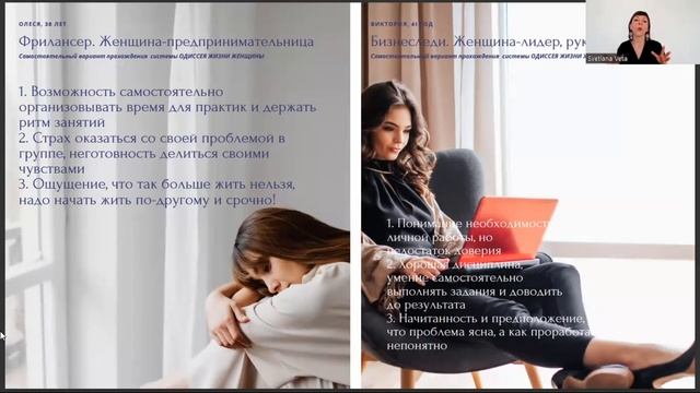 Запишитесь https://t.me/vetasoul_academy на бесплатную диагностическую онлайн-консультацию с ведущей вебинара профессиональным психологом-психотерапевтом Светланой Ветой и за 40 минут получите ответы на три главных вопроса: Где взять энергию? С чего начать? Как перестать ожидать одобрения от других? Мечтаете о том, чтобы чувствовать себя и жить "по-другому" и осуществить то, о чем давно думаете, но боитесь, что без поддержки не справитесь? Получите профессиональный разбор от Светланы Веты по текущей ситуации в жизни, отношениях и карьере, и уже во время первой встречи развивайте навык принятия решения и выхода на действие по авторской методике Светланы https://t.me/vetasoul_academy Профессиональный канал Светланы с подкастами рубрики "Ответы от Веты" и каталогом 100 рекомендаций на все случаи жизни https://t.me/vetasoul_academy Таймкод вебинара 0:00 Вступление, приветствие 0:15 Знакомство с автором Светланой Ветой 1: 27 Презентация вебинара и его главная польза 2:00 Главная метафора для всех, кто не хочет жить по-прежнему 2:29 Презентация премиальной программы Одиссея жизни женщины 3:15 Обращение ко всем женщинам 3:25 Почему 40+ самый сложный возраст женщины 3:50 Возраст автора программы 4:45 Что потребуется, чтобы вебинар был максимально эффективным для вас 5:28 Как родилось название премиальной программы "Одиссея жизни женщины", которую нужно пройти каждой женщине независимо от возраста, но особенно женщинам после 40 лет 6:50 Что будет? 7:34 Что происходит с женщиной после 40 лет? 8:25 Как начать реализовывать свои планы 9:00 Какое состояние встречает женщину к 40+ 9:43 Как разрешить себе начать новую жизнь? 10:10 Как на женщину влияет обусловленная реальность? 11:10 Идти к своей мечте 12:06 Кому помогает программа "Одиссея жизни женщины" 12:45 Жизнь не заканчивается, какое бы испытание Вы не встретили 13:33 Какие события делят жизнь на "до" и "после" 19:22 Какой эффект усугубляет проблематику? 20:11 Как общество навязывает ложные установки 22:06 Что часто происходит с женщиной, которая не обращается за помощью к программе "Одиссея жизни женщины" *здесь на слайде опечатка, конечно, агреССирует* 25:48 Принципиальное отличие женщин, которые прошли "Одиссею жизни женщины" 28:21 Главное качество, которое формируется при прохождении "Одиссеи жизни женщины" 29:10 Возраст не помеха для успеха и счастья 30:26 Брать от жизни всё! 31:43 Кто украл 10 лет жизни от 40 до 50 лет? 35:58 Один ответ на все женские проблемы: "Одиссея жизни женщины"! 36:25 С какими аспектами жизни женщины работает программа "Одиссея" и 4 интеллекта женщины 42:02 Какой вариант прохождения "Одиссеи жизни женщины" выбрать? 43:03 Кому подходит вариант самостоятельного прохождения "Гармония женской души" 43:28 Узнайте себя в кейсах клиенток самостоятельного формата 44:42 Кому подходит групповой формат "Героиня своей жизни" 45:16 Узнайте себя в кейсах ?