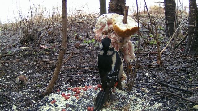 Большой Пёстрый Дятел, самка, ест сало, наблюдение птиц 28 марта, Великий Новгород