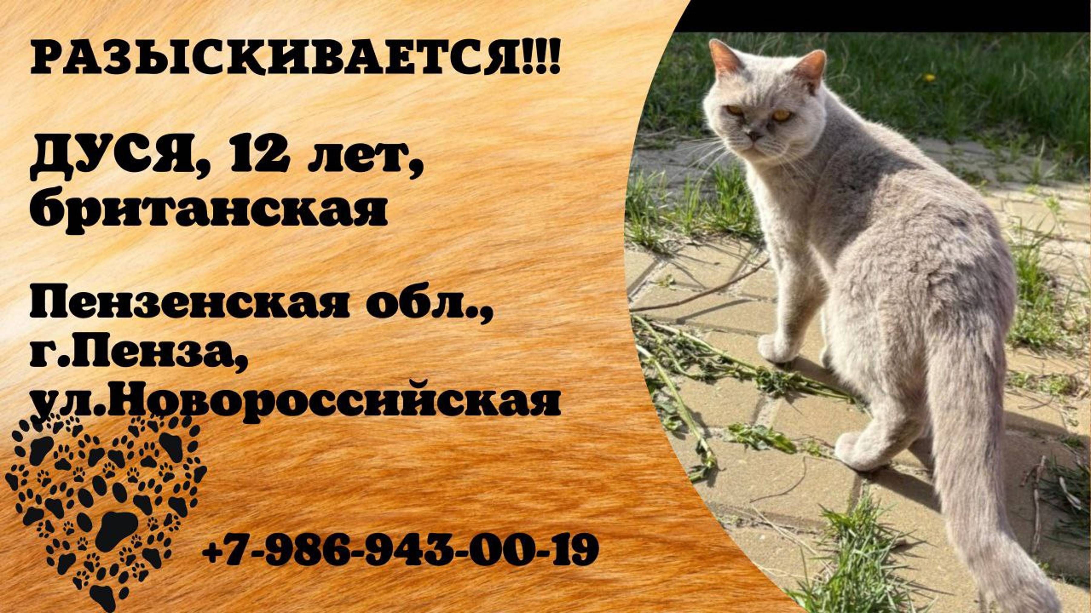 Пропала кошка! ДУСЯ. 12 лет. Британская. Пензенская обл, г. Пенза